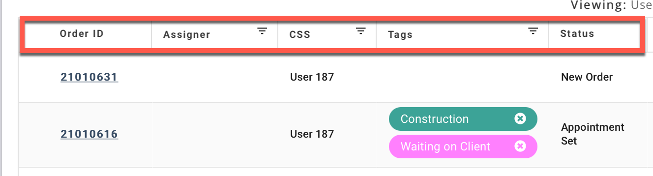 You can filter the orders on the Dashboard Order Table using column filters or the Status Filter.